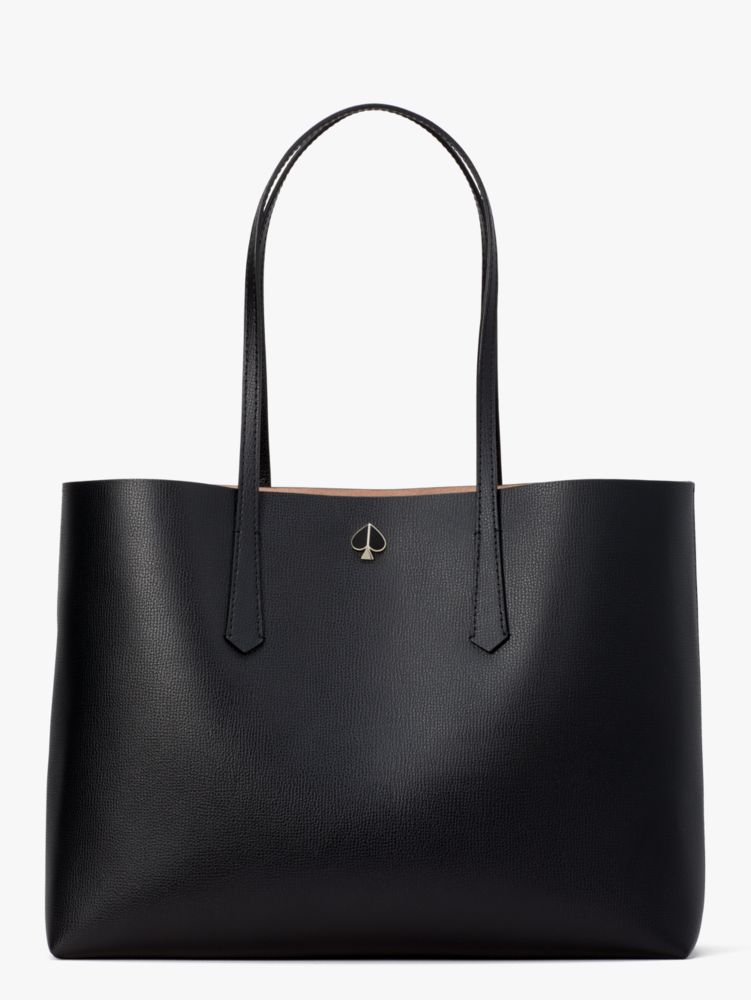 the molly large tote is our answer to the effortless everyday bag. crafted from crossgrain leather, it's structured with a hint of slouch and extremely lightweight so you can carry all your essentials. a removable pouch snaps in and out for even more storage space. and a dog-clip closure keeps the tote closed while giving you easy access to what's inside. finished with our iconic enamel spade and a gold foil emboss logo.