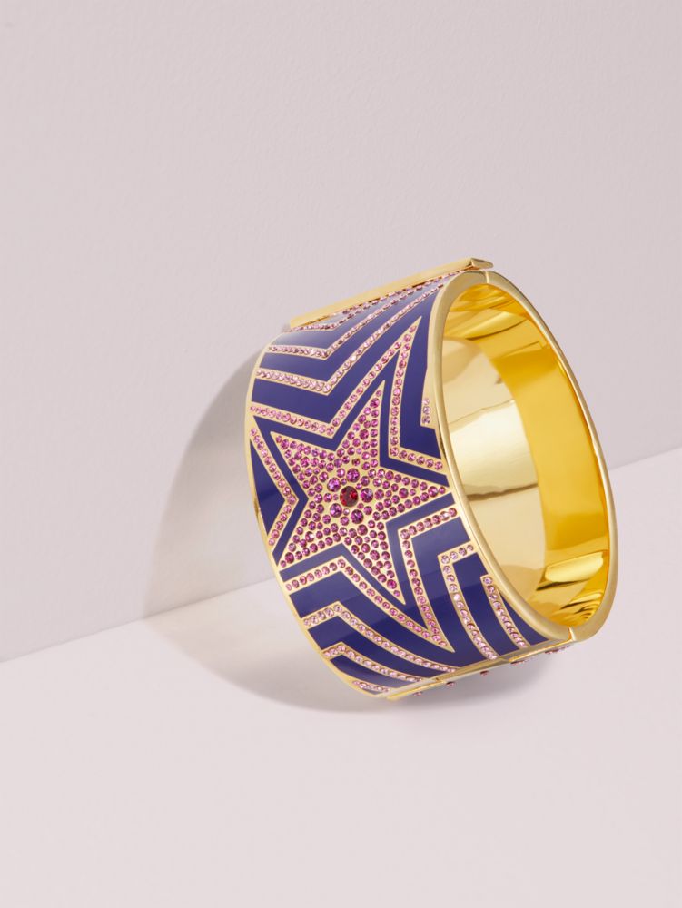 each piece in our star of the show collection is sure to take center stage no matter what you pair it with. this statement bangle is handcrafted of shiny plated metal detailed with a purple star motif and punctuated with tiny pink pavé crystals. allow it to shine all on its own or stack it with other bracelets.